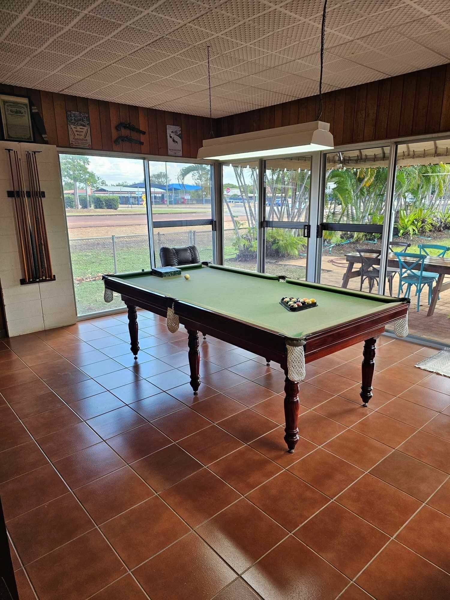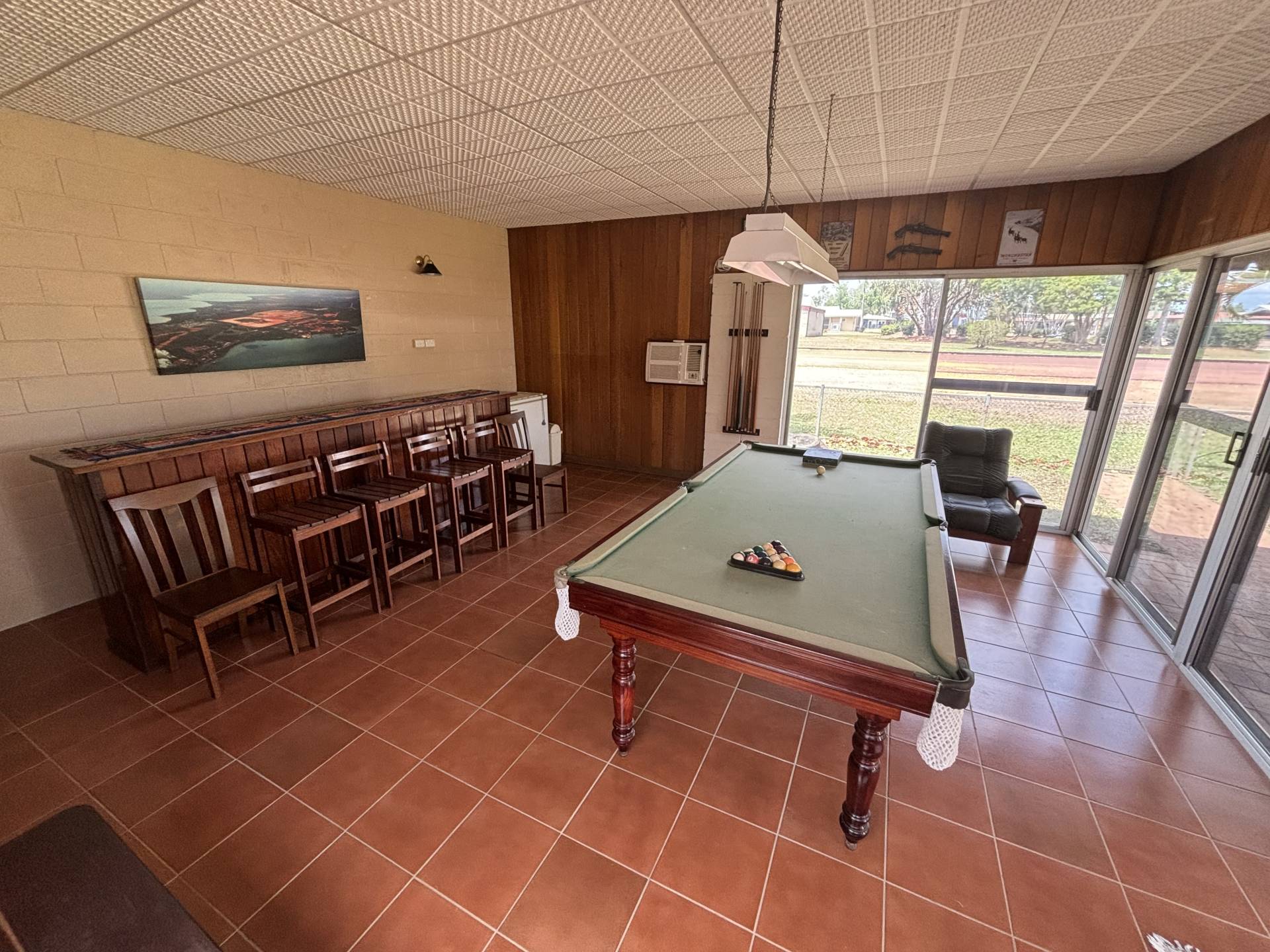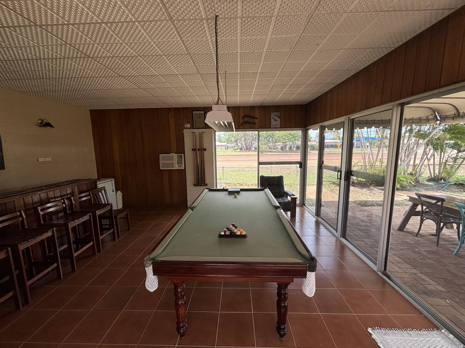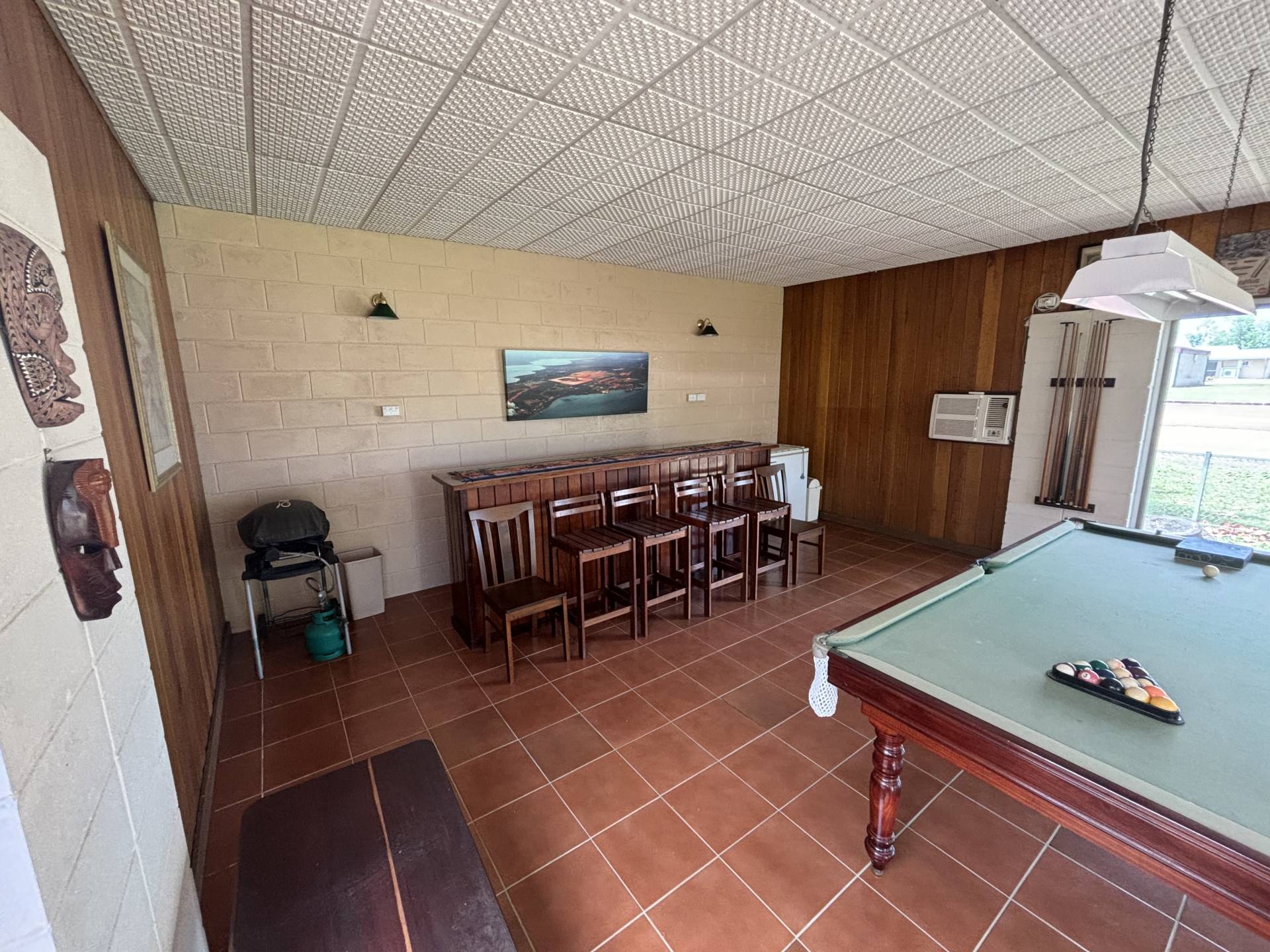 • Fully enclosed, airconditioned, outside pool room complete with bar and pool table, that leads out through the glass doors to the main undercover entertaining area.