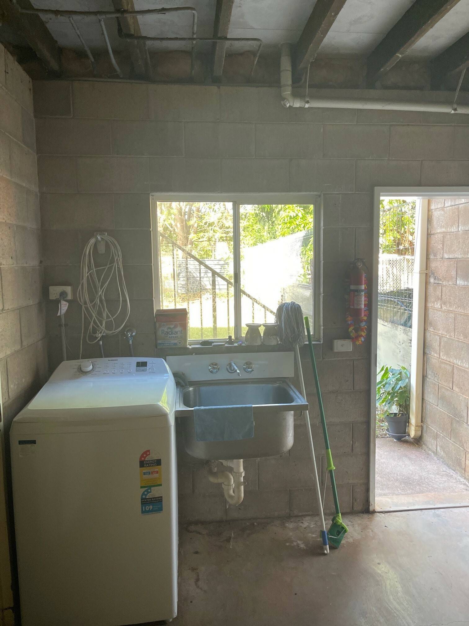 Laundry downstairs with storage area